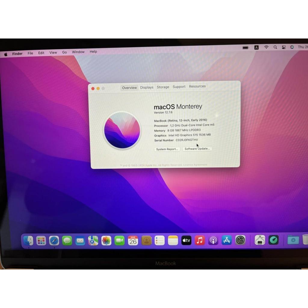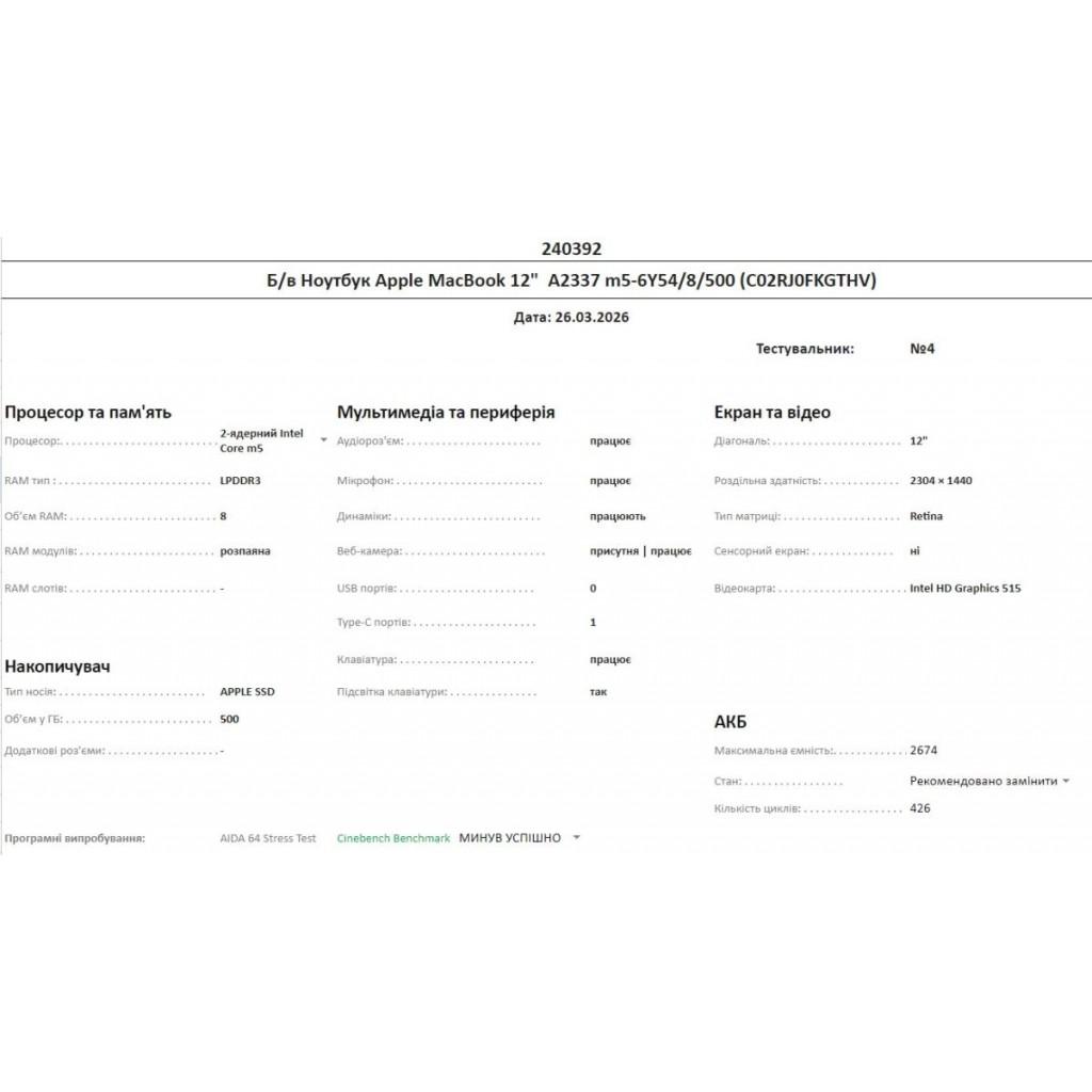 Apple MacBook 12" (2016) / Intel Core m5-6Y54 (2 ядра, 1.2–2.7 ГГц) / 8 ГБ оперативної пам’яті (LPDDR3) / SSD 512 ГБ / Retina дисплей (2304x1440), LED-підсвічування / Intel HD Graphics 515 / 1хUSB-C (Thunderbolt 3, зарядка, DisplayPort) / Wi-Fi 802.11ac, Bluetooth 4.0 / Камера FaceTime 480p / Стереодинаміки / Клавіатура з механізмом "метелик" / Колір Space Grey / macOS