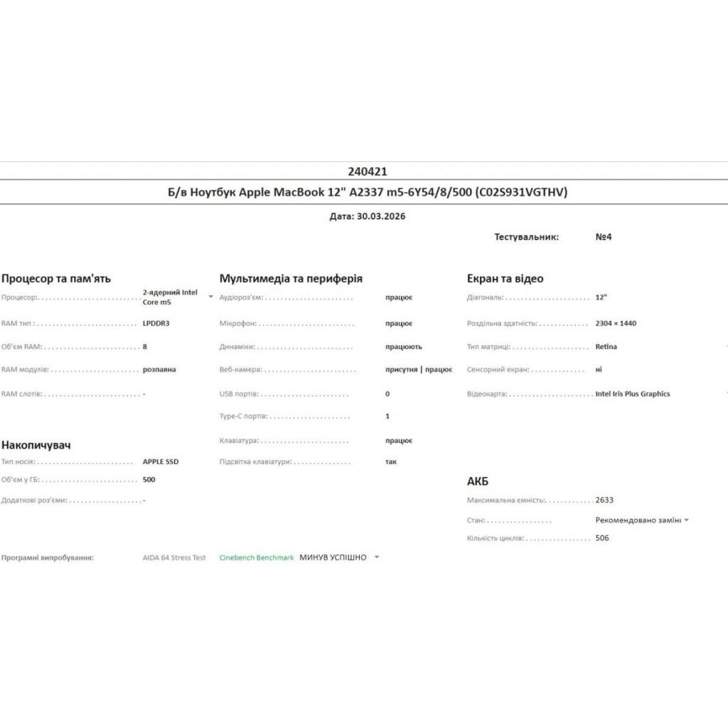 Б/в Ноутбук Apple MacBook 12" A2337 m5-6Y54/8/500 (C02S931VGTHV)