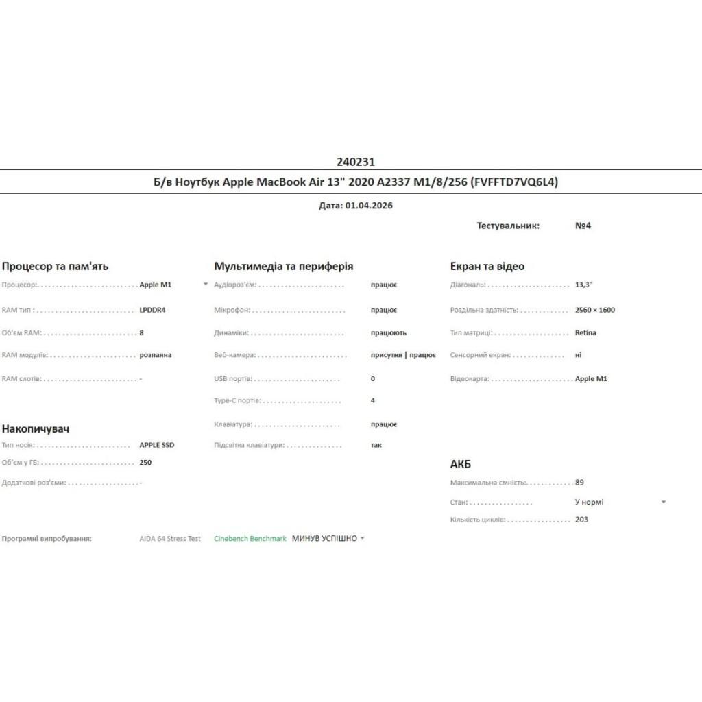 Б/в Ноутбук Apple MacBook Air 13" 2020 A2337 M1/8/256 (FVFFTD7VQ6L4)