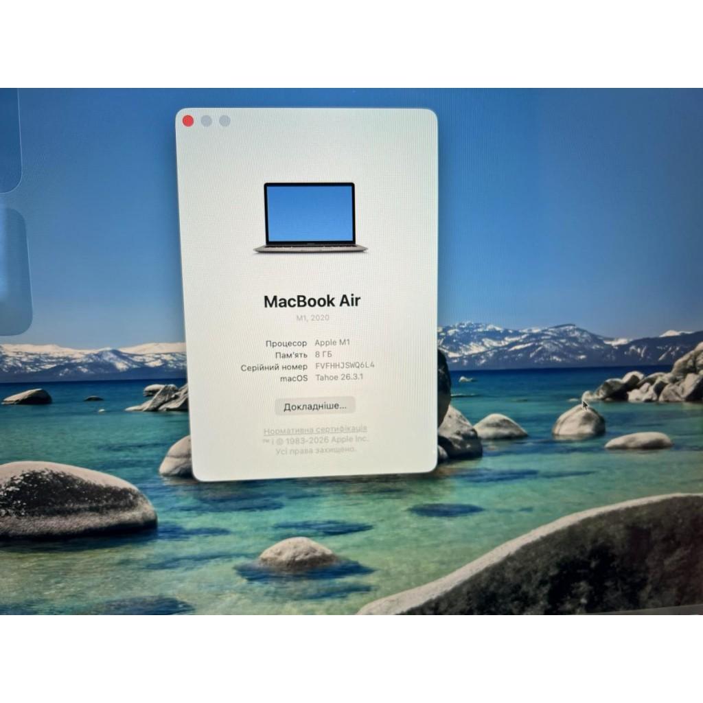 Apple MacBook Air 13" (2020) / Apple M1 (8-ядерний CPU / 7-ядерний GPU) / 8 ГБ уніфікованої пам'яті / SSD 256 ГБ / Retina дисплей (2560x1600), True Tone / 2? Thunderbolt 3 (USB-C) / Wi-Fi 6 (802.11ax), Bluetooth 5.0 / Камера FaceTime HD 720p / Стереодинаміки / Клавіатура Magic Keyboard з Touch ID / Колір Space Grey / macOS