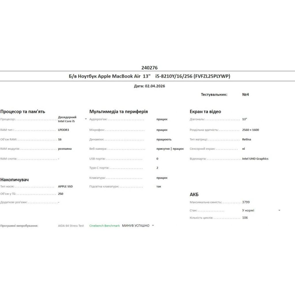 Б/в Ноутбук Apple MacBook Air 13" i5-8210Y/16/256 (FVFZL25PLYWP)