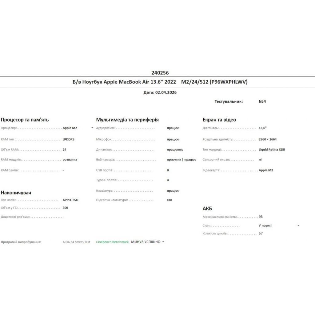 Б/в Ноутбук Apple MacBook Air 13.6" 2022 M2/24/512 (P96WXPHLWV)