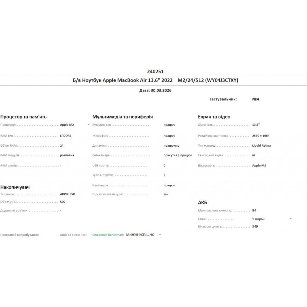 Б/в Ноутбук Apple MacBook Air 13.6" 2022 M2/24/512 (WY04J3CTXY)