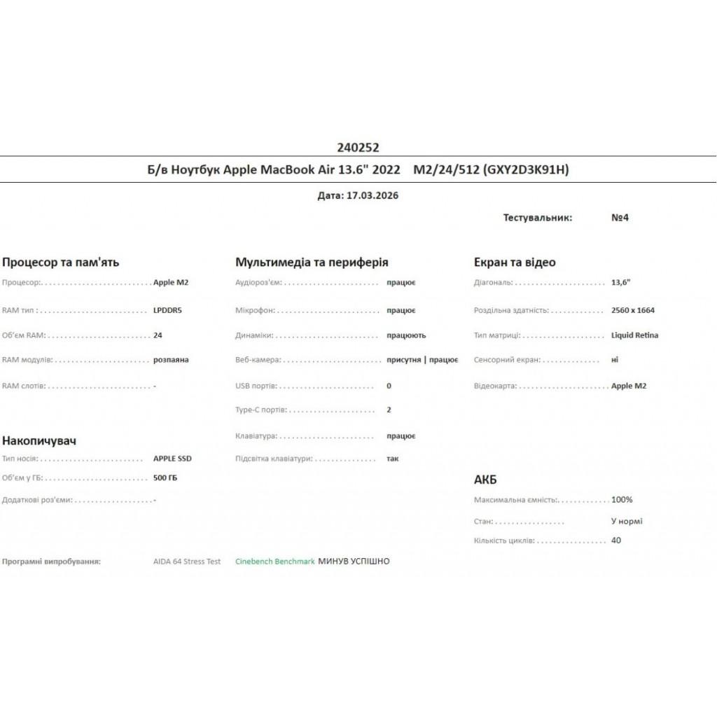Apple MacBook Air 13.6" (2022) / Apple M2 (8-ядерний CPU / 10-ядерний GPU) / 24 ГБ уніфікованої пам’яті (RAM) / SSD 512 ГБ / Liquid Retina дисплей (2560x1664), 500 ніт / 2хThunderbolt 3 (USB-C), MagSafe 3, роз'єм для навушників 3.5 мм / Wi-Fi 6 (802.11ax), Bluetooth 5.3 / Камера FaceTime HD 1080p / Система чотирьох динаміків із просторовим звуком / Клавіатура Magic Keyboard з Touch ID / Колір Space Grey / macOS