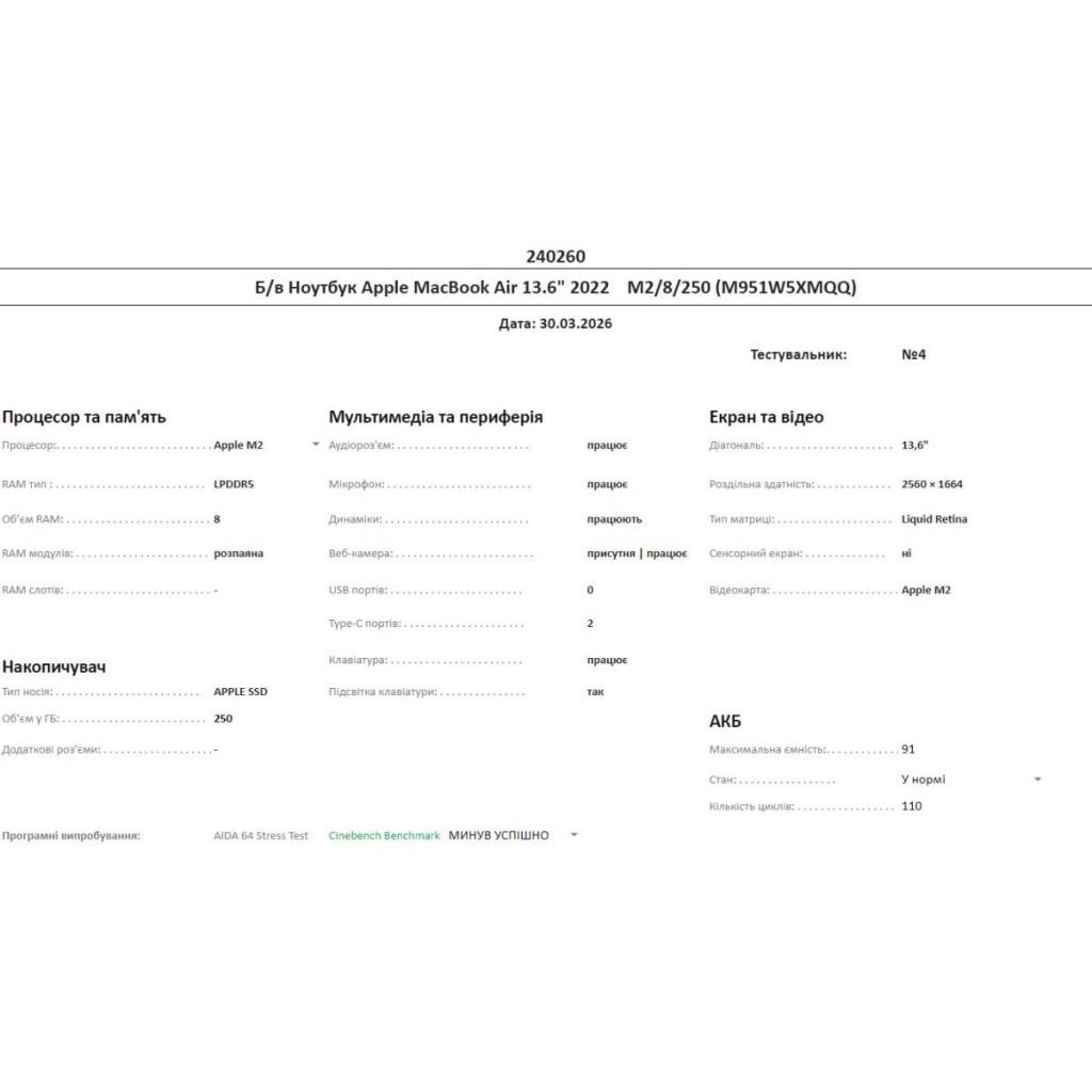 Б/в Ноутбук Apple MacBook Air 13.6" 2022 M2/8/256 (M951W5XMQQ)
