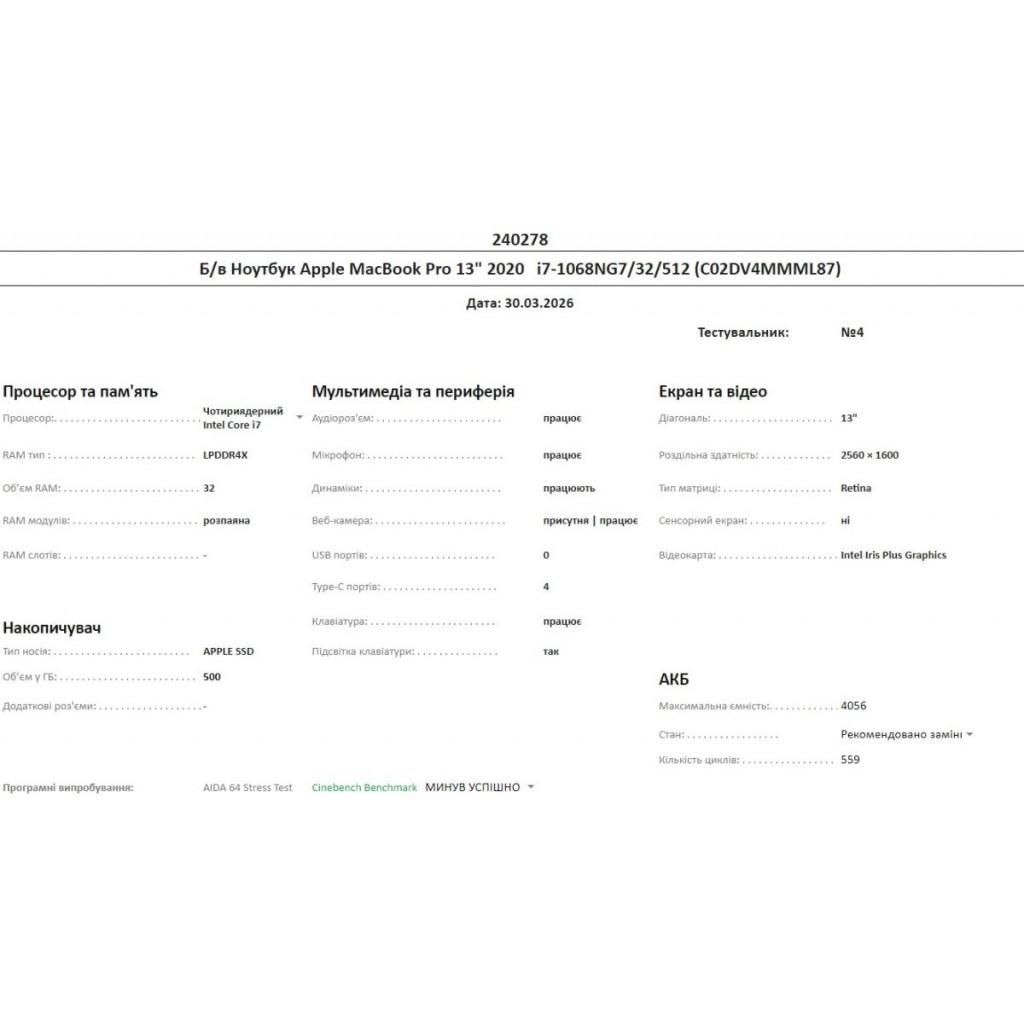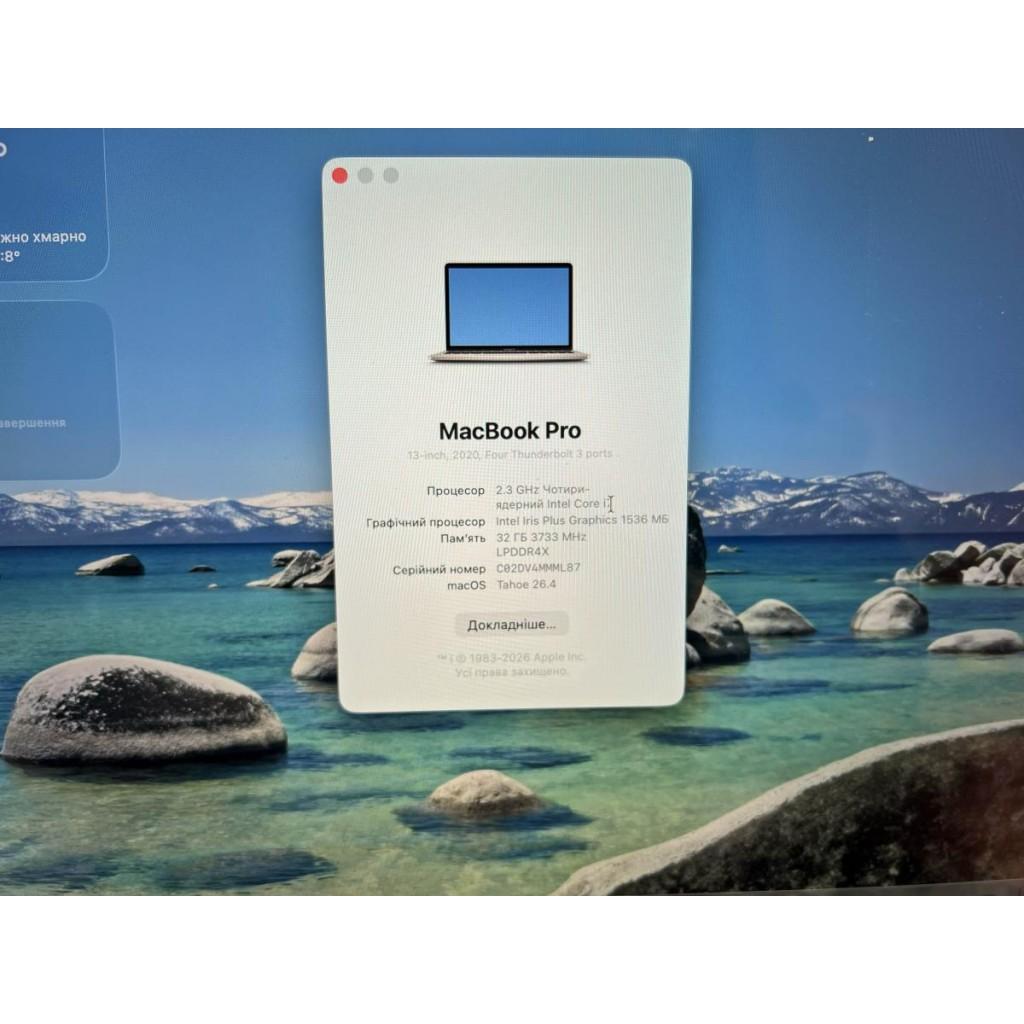 Apple MacBook Pro 13" (2020) / Intel Core i7-1068NG7 (4 ядра, 2.3–4.1 ГГц) / 32 ГБ уніфікованої пам’яті (LPDDR4X) / SSD 512 ГБ / Retina дисплей 13.3" (2560x1600), True Tone / Intel Iris Plus Graphics / 2х Thunderbolt 3 (USB-C) / Wi-Fi 5 (802.11ac), Bluetooth 5.0 / Камера FaceTime HD (720p) / Стереодинаміки з високою динамікою / Клавіатура Magic Keyboard з Touch Bar та Touch ID / Колір Silver / macOS
