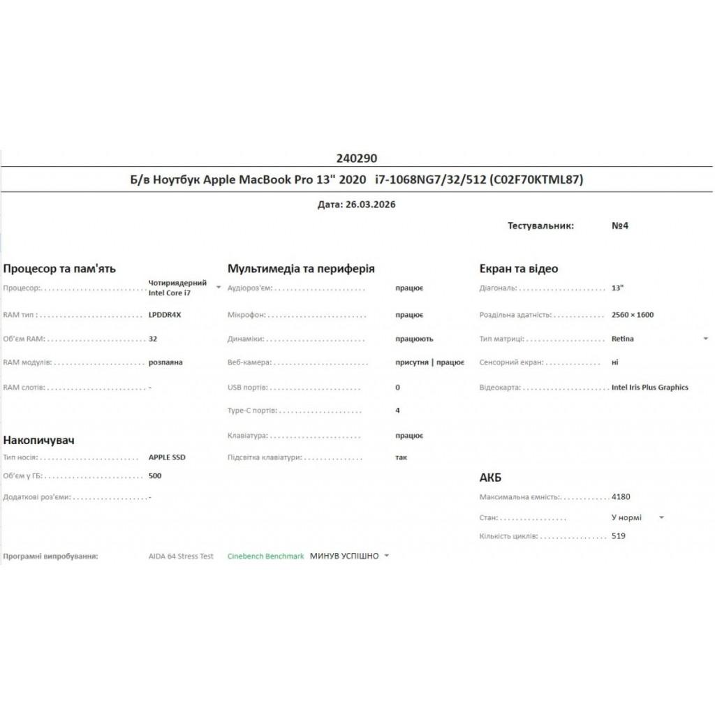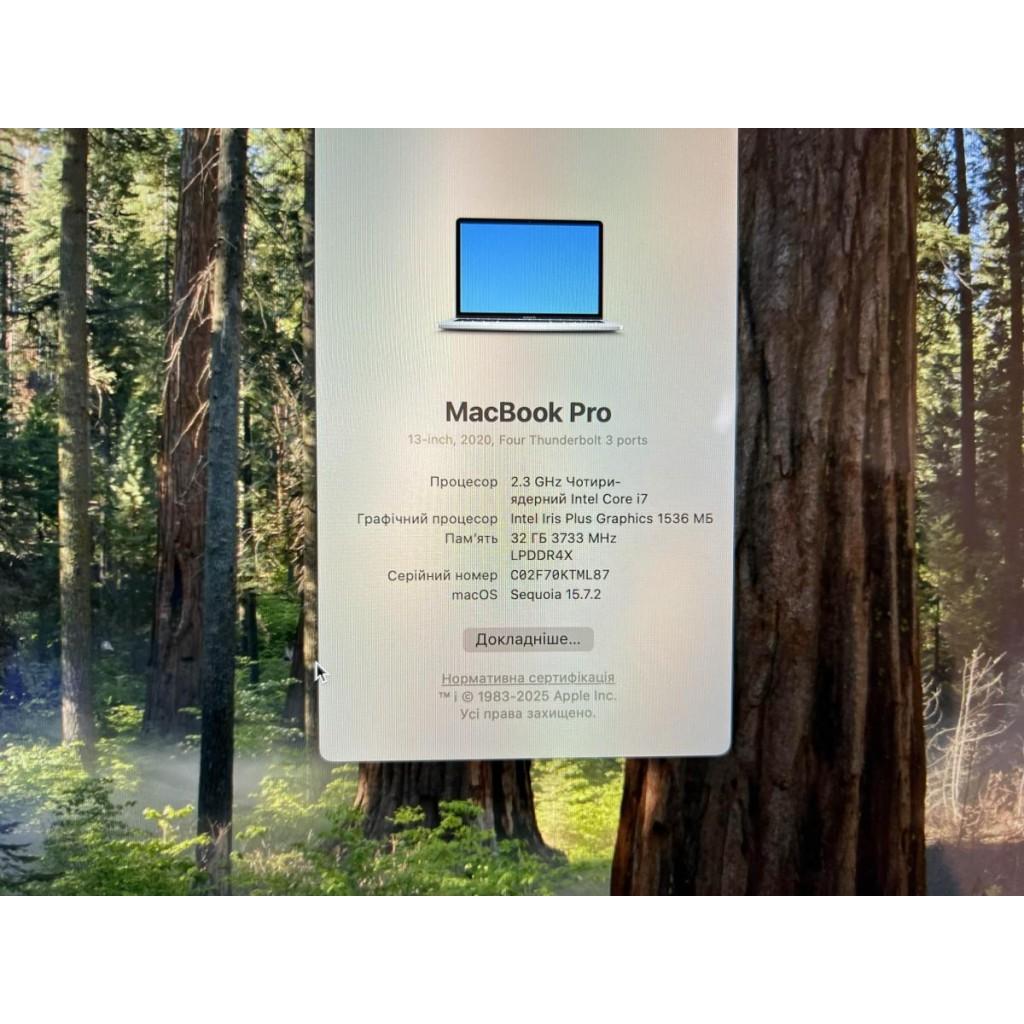 Apple MacBook Pro 13" (2020) / Intel Core i7-1068NG7 (4 ядра, 2.3–4.1 ГГц) / 32 ГБ оперативної пам'яті (LPDDR4X) / SSD 512 ГБ / Retina дисплей (2560x1600), True Tone / Intel Iris Plus Graphics / 2хThunderbolt 3 (USB-C) / Wi-Fi 5 (802.11ac), Bluetooth 5.0 / Камера FaceTime HD (720p) / Стереодинаміки з високою динамікою / Клавіатура Magic Keyboard з Touch Bar та Touch ID / Колір Silver / macOS