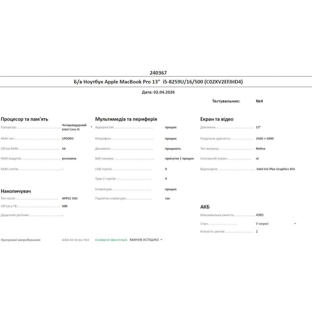 Б/в Ноутбук Apple MacBook Pro 13" i5-8259U/16/500 (C02XV2EFJHD4)