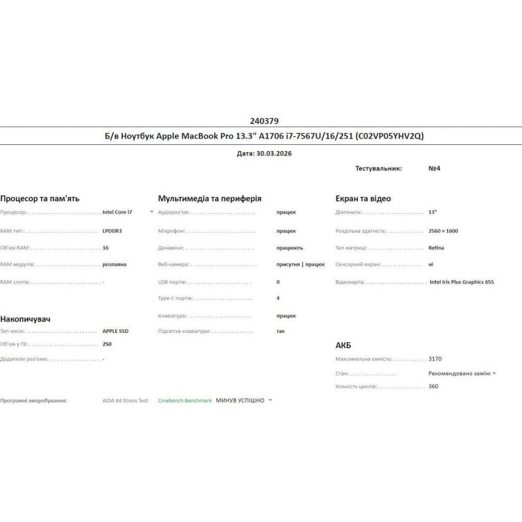 Б/в Ноутбук Apple MacBook Pro 13.3" A1706 i7-7567U/16/251 (C02VP05YHV2Q)