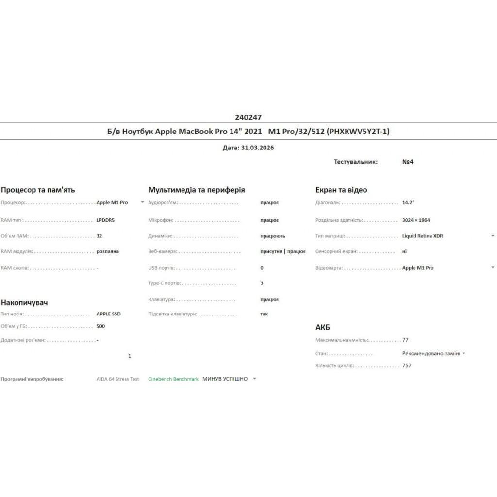 Б/в Ноутбук Apple MacBook Pro 14" 2021 M1 Pro/32/512 (PHXKWV5Y2T-1)