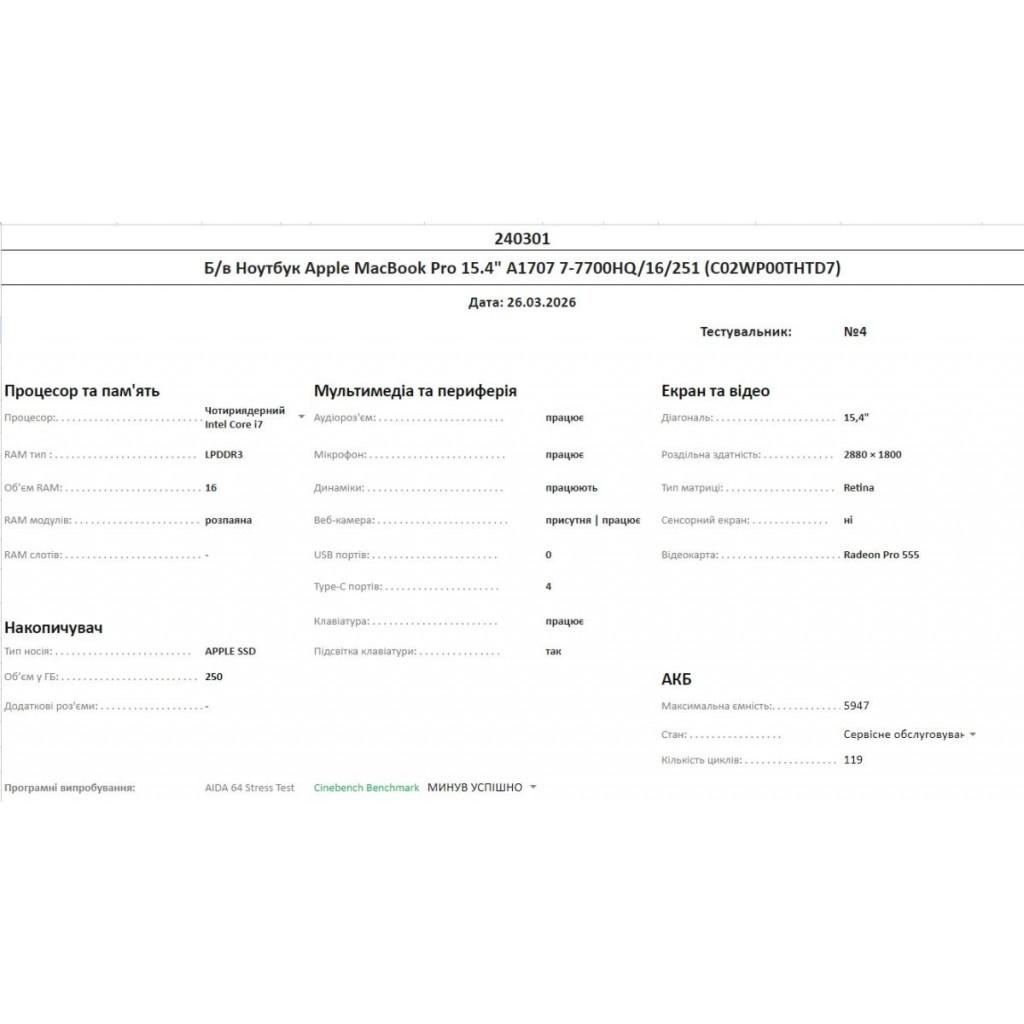 Б/в Ноутбук Apple MacBook Pro 15" 2017 i7-7700HQ/16/256 (C02WP00THTD7)