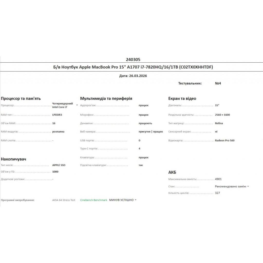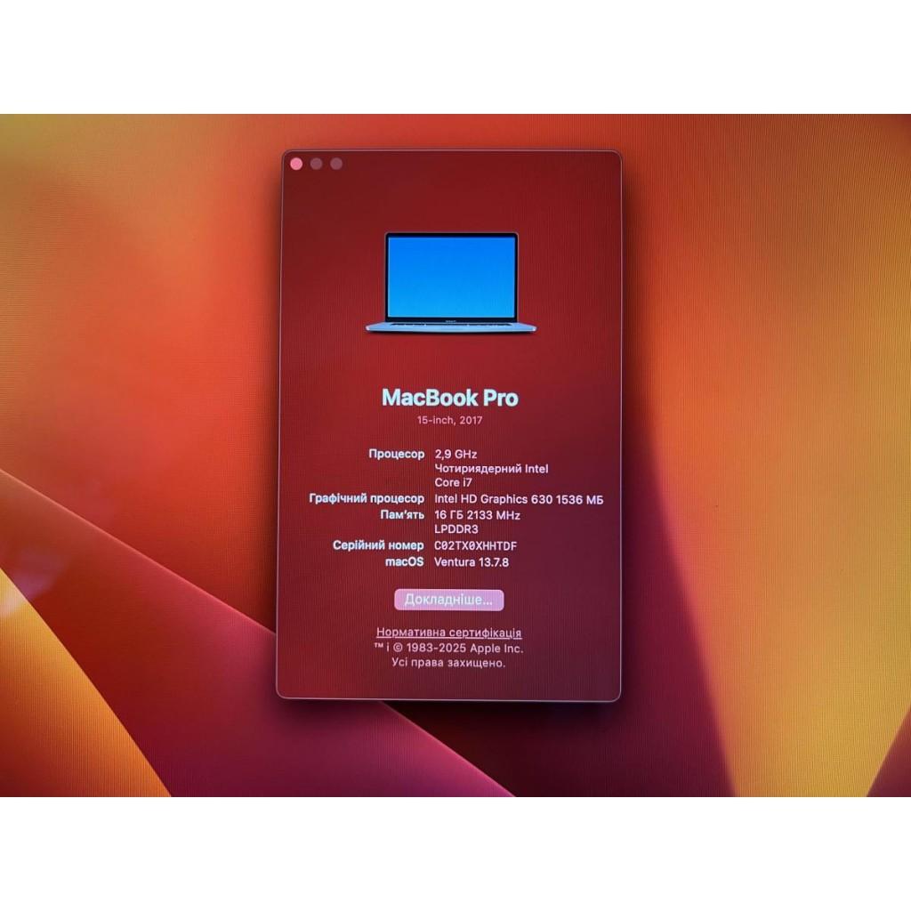 Apple MacBook Pro 15" (2017, A1707) / Intel Core i7-7820HQ (4 ядра, 2.9–3.9 ГГц) / 16 ГБ оперативної пам’яті (LPDDR3) / SSD 1 ТБ / Retina дисплей 15.4" (2880x1800), True Tone / AMD Radeon Pro 560 (4 ГБ GDDR5) + Intel HD Graphics 630 / 4хThunderbolt 3 (USB-C) / Wi-Fi 5 (802.11ac), Bluetooth 5.0 / Камера FaceTime HD (720p) / Стереодинаміки / Клавіатура з Touch Bar та Touch ID / Колір Space Gray / macOS