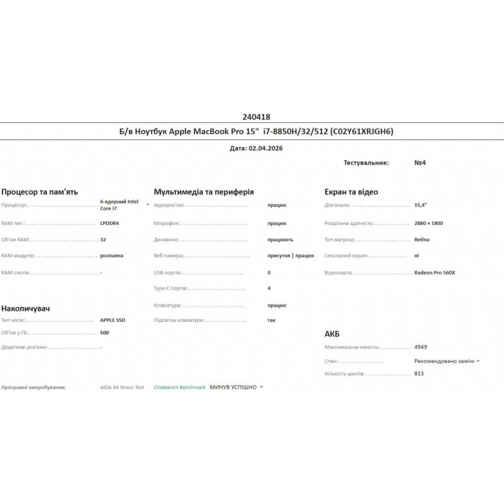 Б/в Ноутбук Apple MacBook Pro 15" i7-8850H/32/512 (C02Y61XRJGH6)