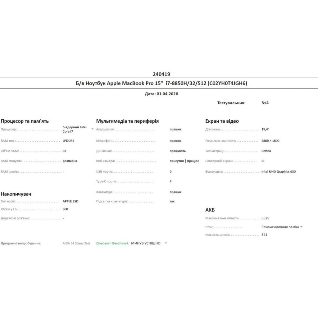 Б/в Ноутбук Apple MacBook Pro 15" i7-8850H/32/512 (C02YH0T4JGH6)