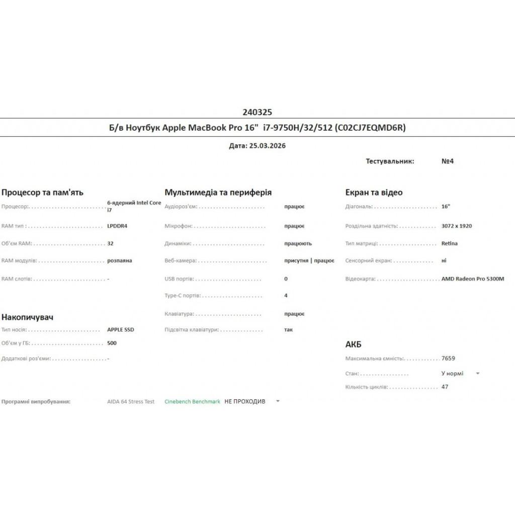 Б/в Ноутбук Apple MacBook Pro 16" 2019 i7-9750H/32/512 (C02CJ7EQMD6R)