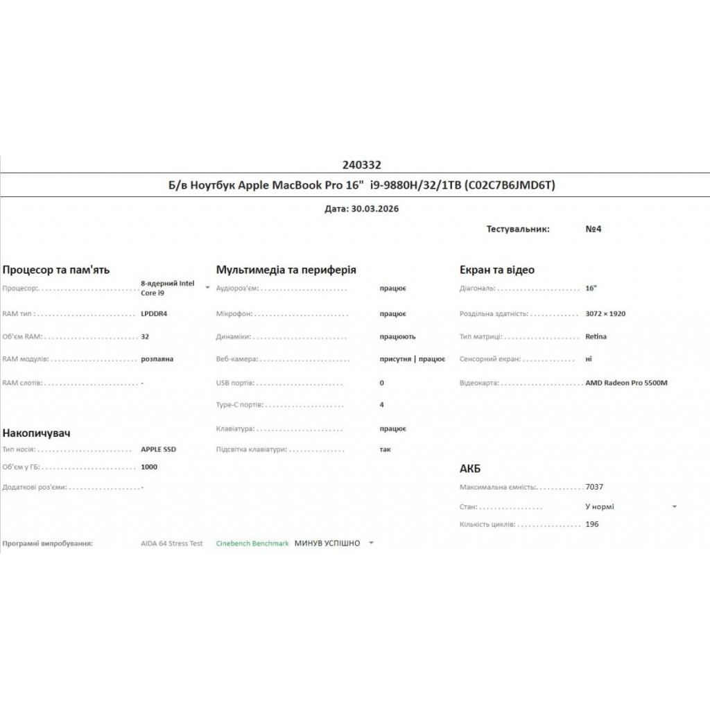 Б/в Ноутбук Apple MacBook Pro 16" 2019 i9-9880H/32/1TB (C02C7B6JMD6T)