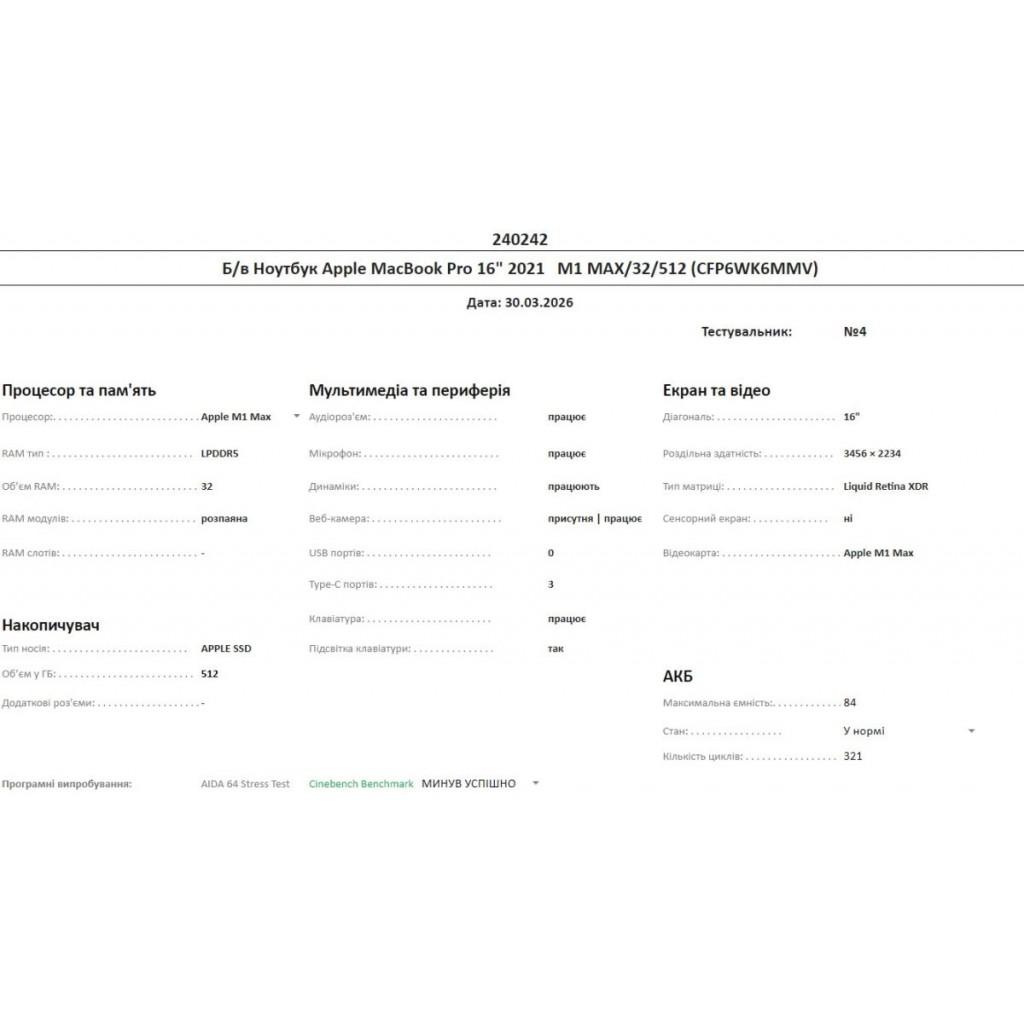 Б/в Ноутбук Apple MacBook Pro 16" 2021 M1 MAX/32/512 (CFP6WK6MMV)