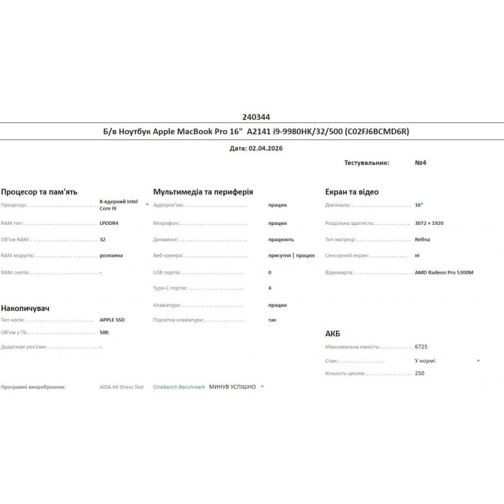 Б/в Ноутбук Apple MacBook Pro 16" A2141 i9-9980HK/32/500 (C02FJ6BCMD6R)