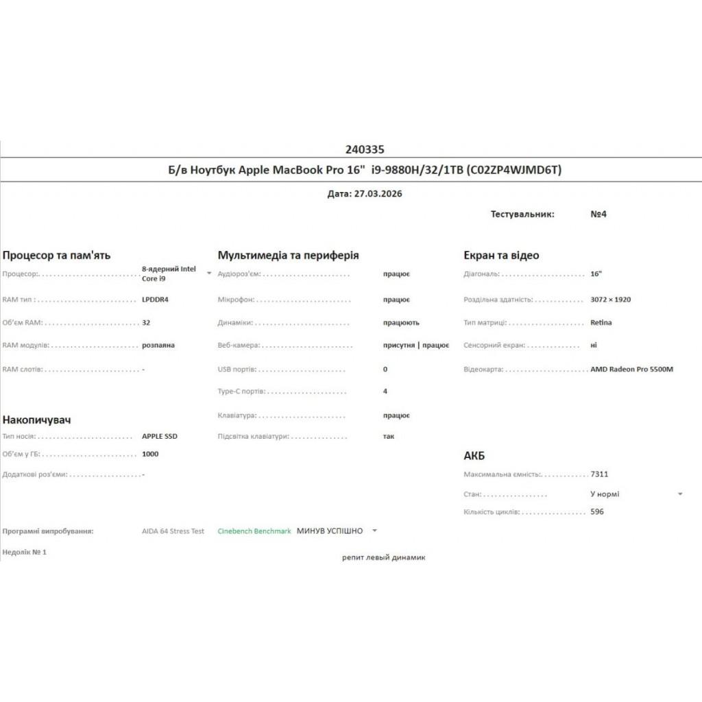 Б/в Ноутбук Apple MacBook Pro 16" i9-9880H/32/1TB (C02ZP4WJMD6T)